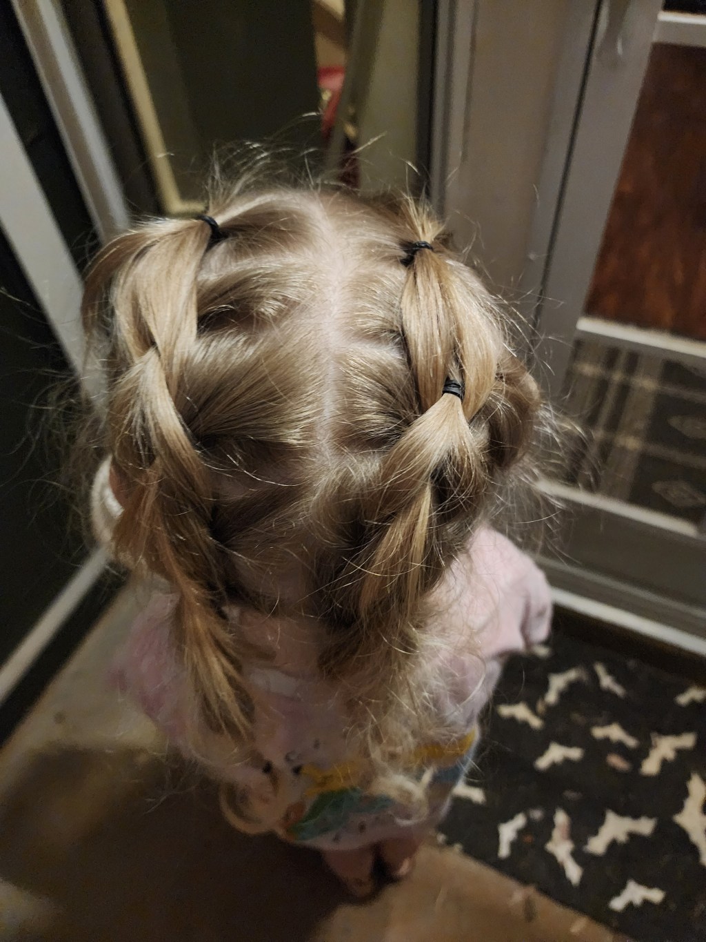 - Doing the kids’ hair: A rushed process because Nyx is climbing, grabbing the brush or spray.